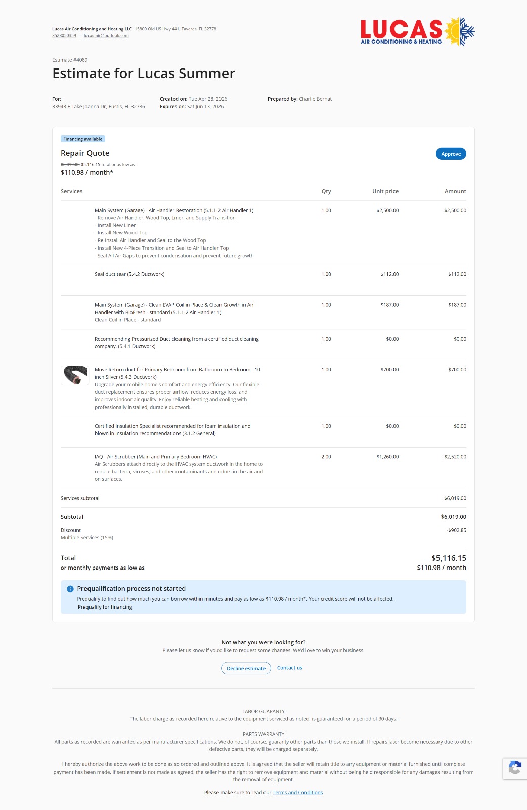 Ask: Full NADCA-compliant duct cleaning of the entire system, with extra attention to the contaminated runs flagged above, to reach verified-clean status. Est. $1,500